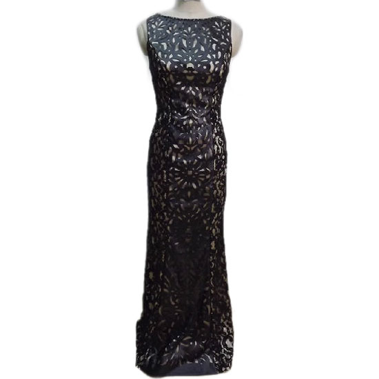 This ladies' evening dress boasts a chic, elegant and dainty design. It features a smooth lining and a PU leather shell with black cut-out patterns. This noble dress surely is an ideal choice for high-end parties.