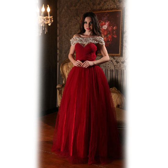 This is a ladies' evening dress with an elegant design in red. It features a nice collar which is finely beaded with shimmering elements. The sweetheart neckline adds a sexy and unique touch to this design.