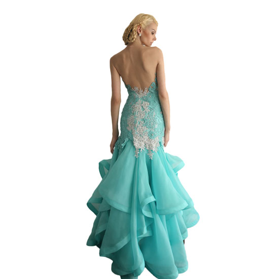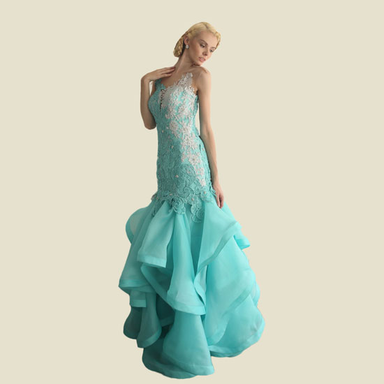 This is a ladies' evening dress with an elegant and deluxe design. It features a slim-cut body with a sophisticated and exquisite Prada brocade fabric. The multilayer skirt with wavy sides completes this design for a noble and eye-catching look.