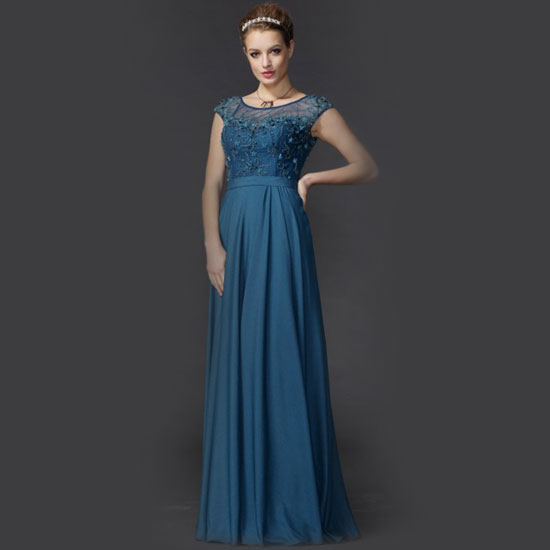 This is a ladies’ evening dress that features a classic round neckline, short sleeves and a pleated skirt. The allover lace details on the upper add a touch of style to the whole piece. This fashionable evening dress is an ideal addition to complete your wardrobe.