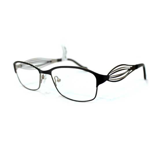 These full-rim ladies' eyeglasses feature a square-shaped frame made from stainless steel. The unique temples spotlight a 3D olive-shaped design. The adjustable nose pads guarantee comfortable wearing.