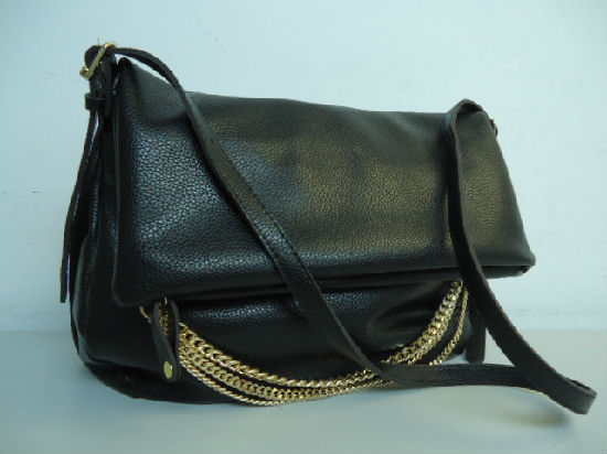 Ladies fashion handbag with light gold metal decor on front and with pvc flap