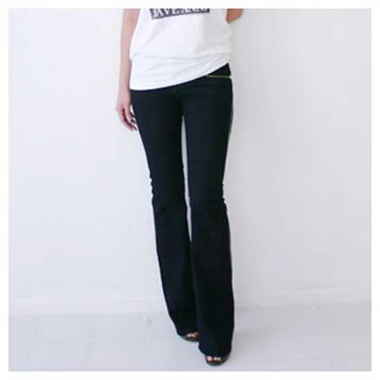 The ladies' pants showcase flared-leg cutting and distressed patterns near the knees. They are made of soft fabric for great wearing comfort. These plain-colored pants are easy to mix and match with different tops.
