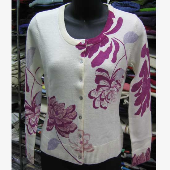 The ladies' long-sleeve cardigan has a round neckline and button placket. It is imprinted with floral patterns in fuchsia color all-over. This ultra-soft cardigan makes a great layering item.
