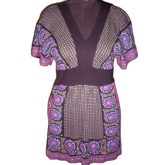 Showcased is a ladies' short-sleeve tunic with a V neckline. It features geometrical and floral prints throughout for an exotic touch. Add this unique tunic to your wardrobe.
