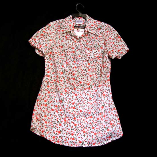 The ladies' short-sleeve shirt is covered with little blooming flowers, showcasing a touch of summer and spring. It features a buttoned front closure with a snap chest pocket. Complete your summer wardrobe with this flower-print shirt.
