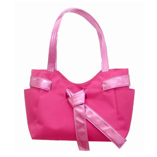 Th ladies handbag is in fashion design. It is made of environmental friendly material. A pink ribbon is decorated on the bag.