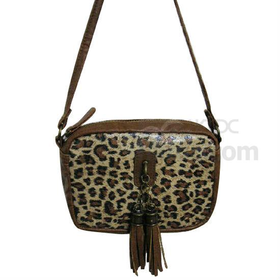 Fashion ladies' top zip bag with long shoulder strap, front in Leopard print PU, other in leather look PVC, front with 2 tassels for decor.