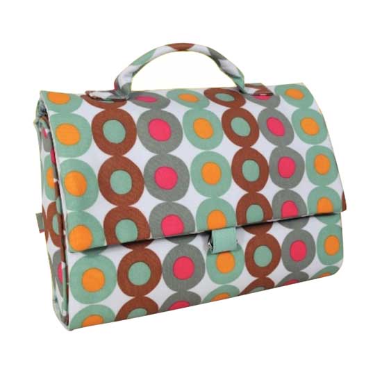 This ladies' handbag showcases a unique design. The panel is printed with appealing round patterns in contrasting tones. The tough handle is sturdily fixed for reliable carrying.