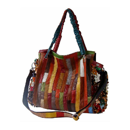 Displayed is a handbag designed for the young and passionate ladies. The patchwork patterns in colorful hues are eye-catching and stylish. The floral embellishment brings this handbag a sweet vibe.