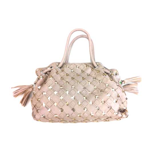 This beige handbag with mesh patterns at the exterior features golden-toned metallic decorations for a characteristic look. The fringes at sides bring a lively accent to the design. This stylish handbag is an ideal choice for modern ladies.