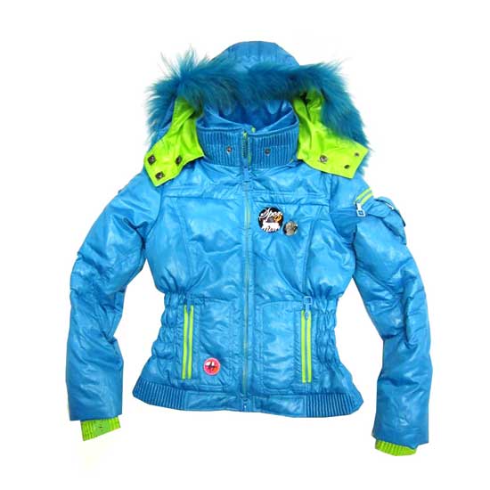 Outlined is a ladies' jacket with a removable hood that is accessorized with real raccoon fur. The back and front are decorated with metal badges for enhanced stylishness. This ladies' jacket is a classy and warm winter outfit for chic ladies.