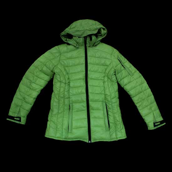 This ladies’ padded jacket comes with a solid green hued appearance for a captivating winter look. The standing collar and hood design promises added protection in cold days. The smooth zipper closure ensures convenient wearing.