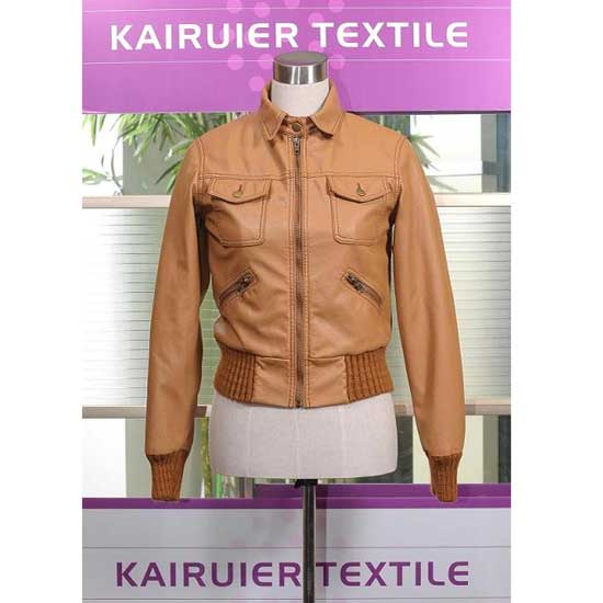 Featured is a biker jacket designed to fit feminine figures. The warm caramel tone suggests a fashionable style. The ribbed hem and cuffs ensure a flattering fit.