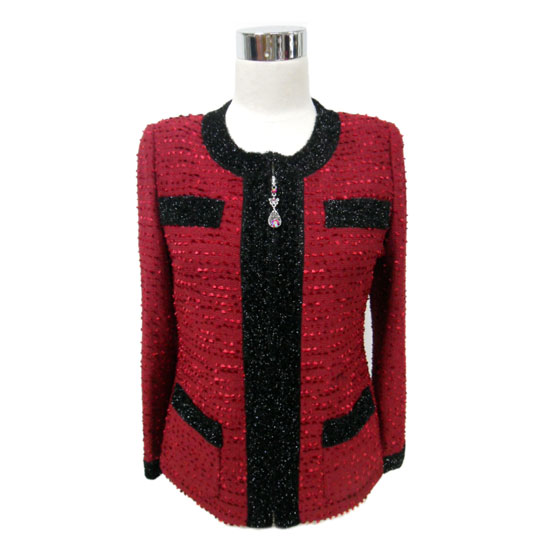This is a ladies' jacket with a chic and elegant appearance. It is designed in red with black accents for a touch of uniqueness. This jacket is made of high-quality material with excellent craftsmanship.