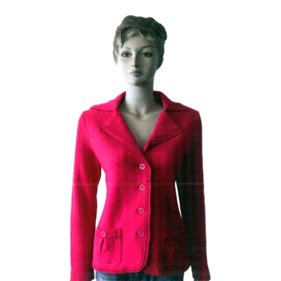 This is a ladies' jacket coming with a red finish. It is accented with a wide notched collar for a neat look. It comes with 2 little pockets for practical use.