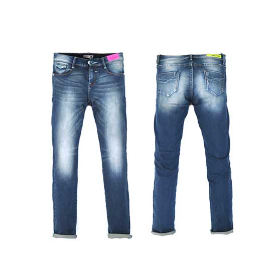 Displayed is a pair of ladies' jeans that comes in a washed out style. Made of 100 cotton, this pair of jeans is close-fitting and breathable at the same time. This fashionable pair of jeans is a good choice for the weekend.
