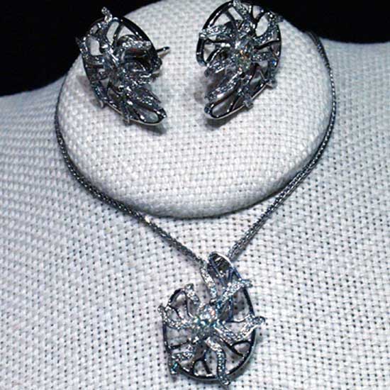 This set of stylish jewelry includes a pair of earrings and a necklace. They boast an 18K white gold construction with dazzling diamonds all over. This gorgeous set of jewelry is suitable for special occasions.