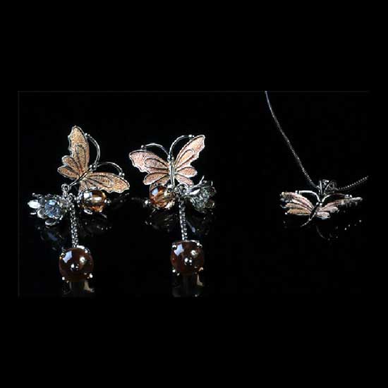 The featured ladies' jewelry set features a necklace and a pair of earrings in shared style. The items are gracefully embellished by butterflies that are made up of polished wires. The earrings are adorned with clear and reflective crystals, boasting an elegant design. The set simply radiates the charm of a lady.
