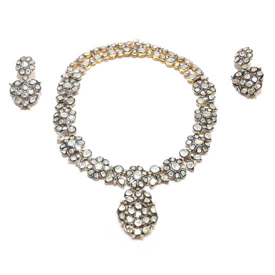 Presented is a gorgeous jewelry set flaunting a classy appearance. The shiny gold settings of necklace and earrings are embellished all over with fancy-cut diamonds. The diamonds bring out enchanting dazzles to capture ladies’ hearts.