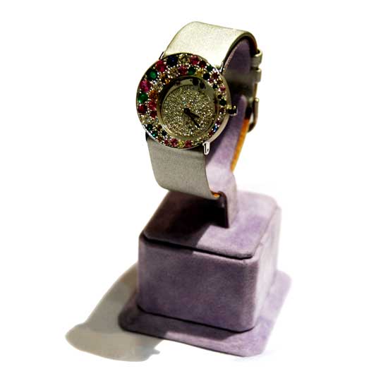This gorgeous watch plays with colors and styles. The watch is finely crafted with 18k white gold, diamonds, rubies, emeralds and sapphires for a touch of elegance and playfulness. This dazzling watch instantly melts any female being's heart.
