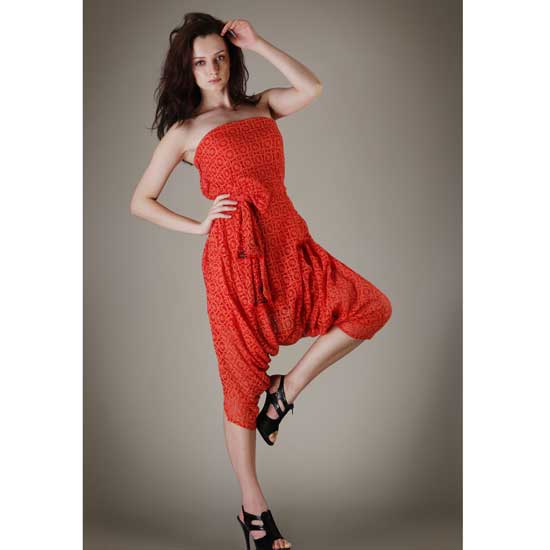 This stylish ladies' jumpsuit consists of a sleeveless top and a pair of harem pants. The bold, red jumpsuit is accented with a butterfly bow on the waist. Crafted of cotton and nylon, the jumpsuit is lightweight and comfortable for wearing.