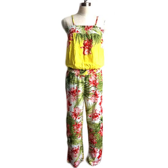 This is a ladies' jumpsuit with a fashionable and eye-catching design. It is made of 100% rayon with a knitted lining on top. The eye-catching floral patterns highlight your look for enhanced attractiveness.