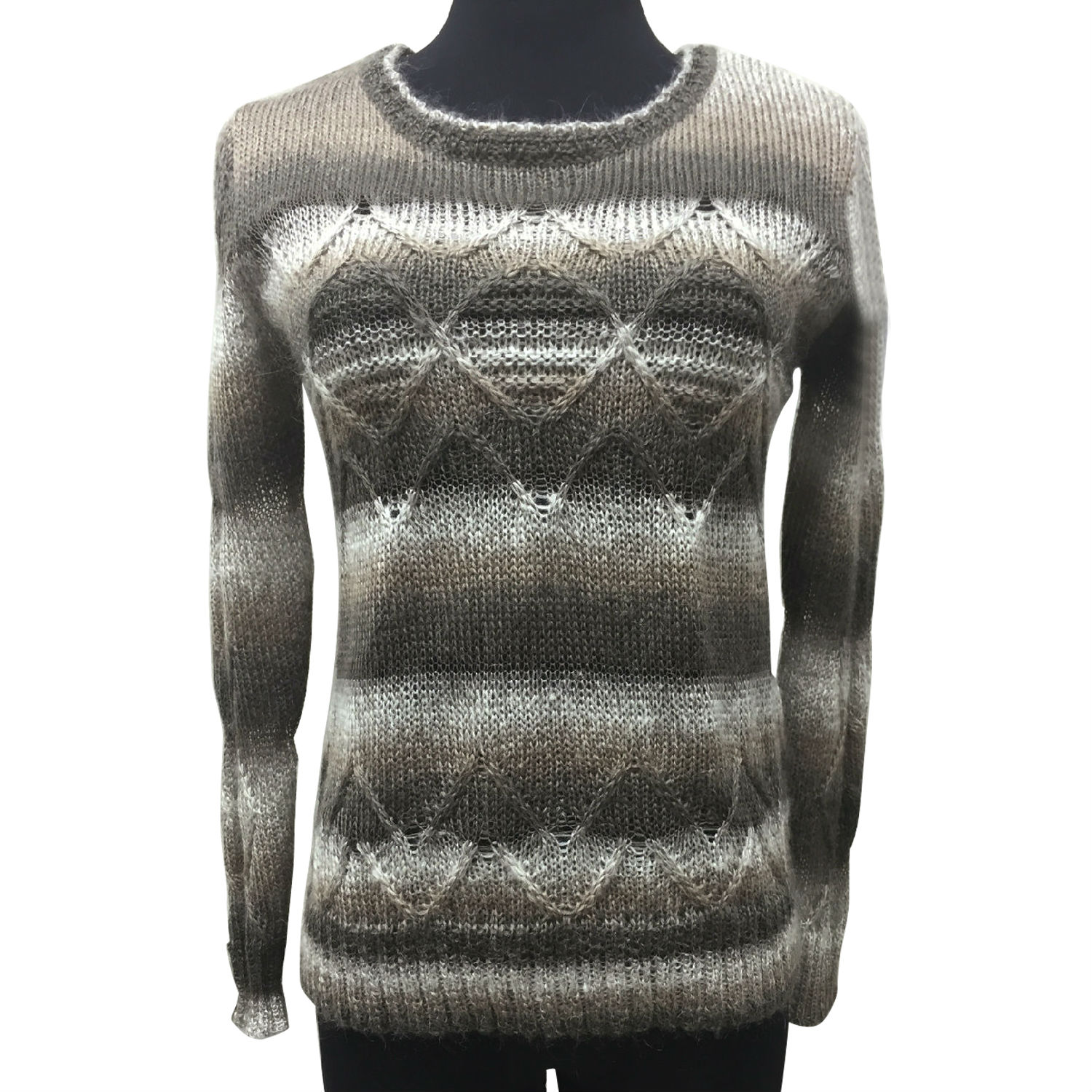 Get your hands on this quality knitwear for ladies. Manufactured with rather loose knit, this pullover features a beautiful gradient pattern for a stylish touch. Such an intarsia knit has a subtle zigzag knit pattern over the bodice, which makes the outfit a laidback yet refined one.