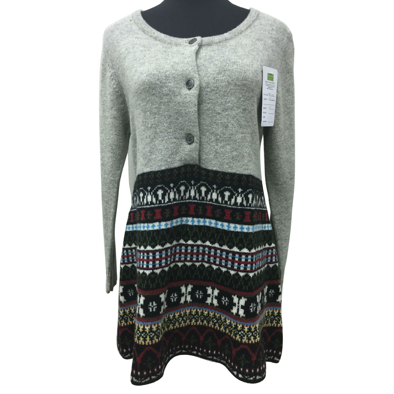 This is a simple yet comfortable long-sleeved dress for a casual look. The bodice part comes in a light, solid color and button placket in the middle, while the skirt part features Fair Isle pattern which spices up the garment nicely. This dress is made of 50% wool and 50% acrylic, which is very durable and easy to clean.