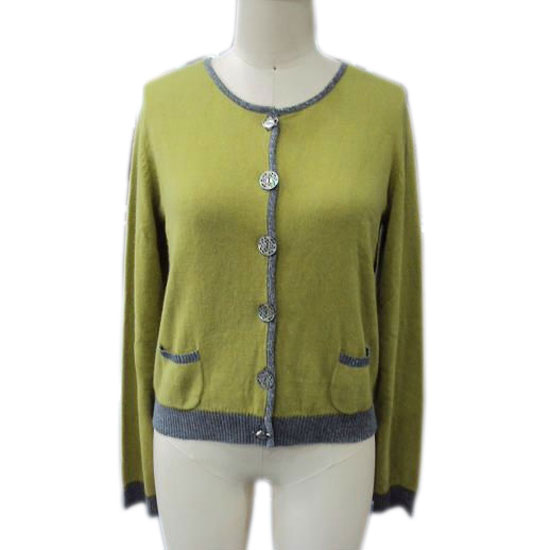 The ladies' knit cardigan is made of 35% cotton, 28% viscose and other quality materials. It features a pleasing light green background highlighted by dark gray bindings. The front buttons are delicately crafted for enhanced appeal.