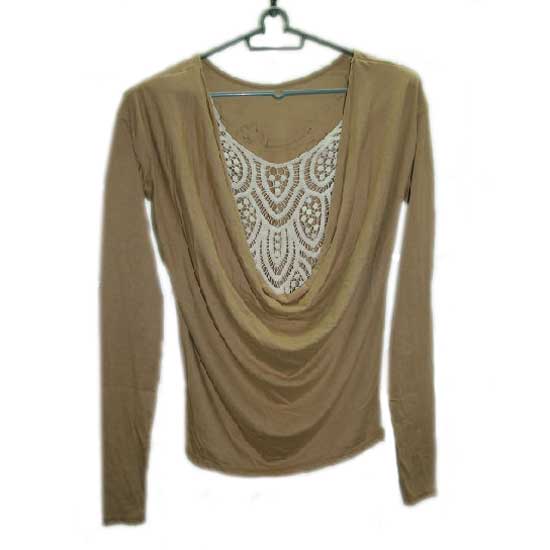 This ladies’ knitted blouse in brown is inserted with an intriguing white lace decoration at the neck for added appeal. The draping shawl collar design is sure to be the center of focus. This trendy knitted blouse is made of 100% organic cotton for wearing comfort.