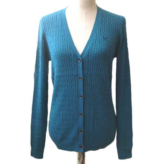 This showcased ladies’ knitted cardigan is designed in a blue color for a stylish touch. It features long sleeves, a V-neckline and a button-up closure. This cardigan is made of 60% cotton, 30% nylon and 10% angora for a comfortable touch.