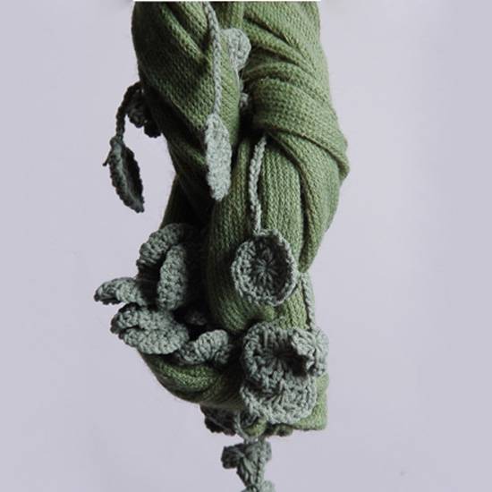 Featured is a ladies' scarf in a fashionable design. It comes with knitted circular adornments that add a unique touch to the entire piece. This scarf makes a stylish way to add color to your favorite outfit.