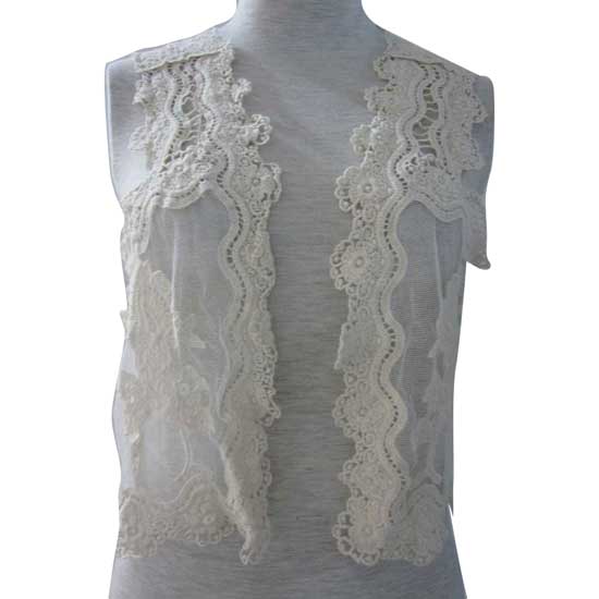 This ladies' vest is a whole-piece lace with a soft and comfortable texture. The neckline, sleeves and opening boast floral detailing for further feminine essence. The cropped design covers up to the waist for a stylish touch. This lace vest offers breathable comfort with exceptional elegance.