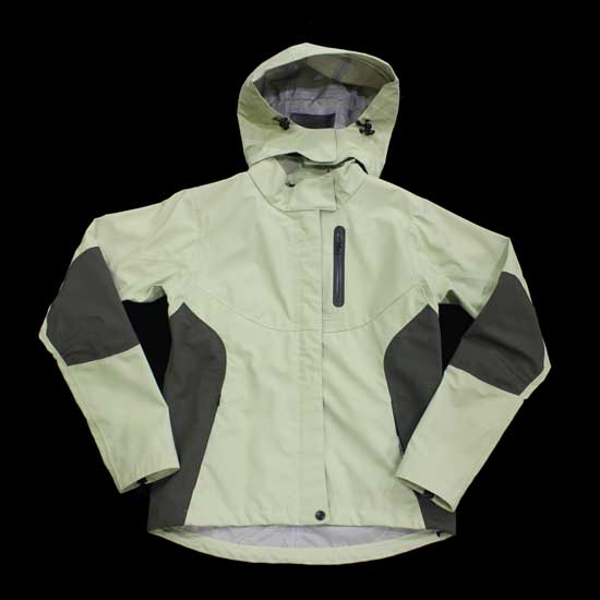 This lamination jacket features a clean design in light green. The dark green patches on the sleeves and sided bodice spice up the entire appearance. The windproof jacket is finished with a zipper and snap button closure.