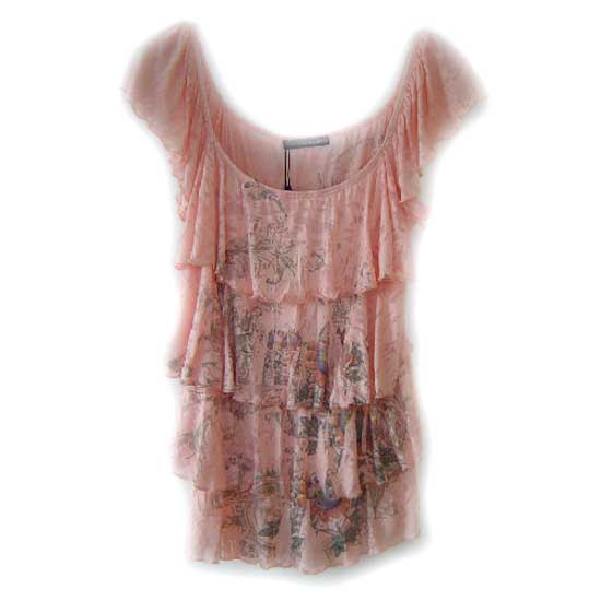 This ladies' T-shirt features multiple layers of ruffled fabric for a romantic touch. The wide round neckline adds a feminine, sweet touch to the garment. This beautiful top is an ideal choice for spring and summer.