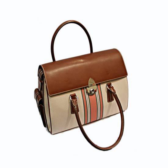 This is a ladies' leather handbag with multi-color stripes. The leather handles and the flap closure with accented stitching give it a classic touch. Show off your style with this elegant handbag.