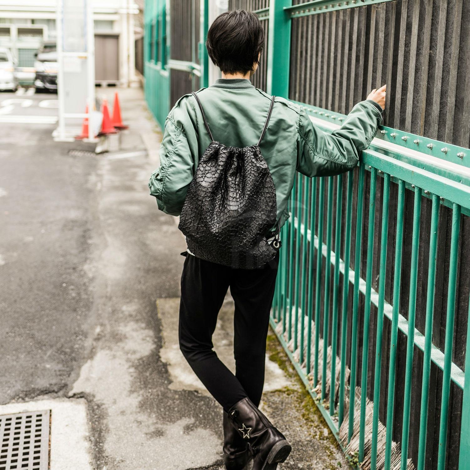 This group features really special and unique snake embossed fabric. The wool fabric combined with Japanese paper “WASHI” and embossed with a snake pattern. Stylish and functional as tote bag and on trend backpack give off this bold material feeling.