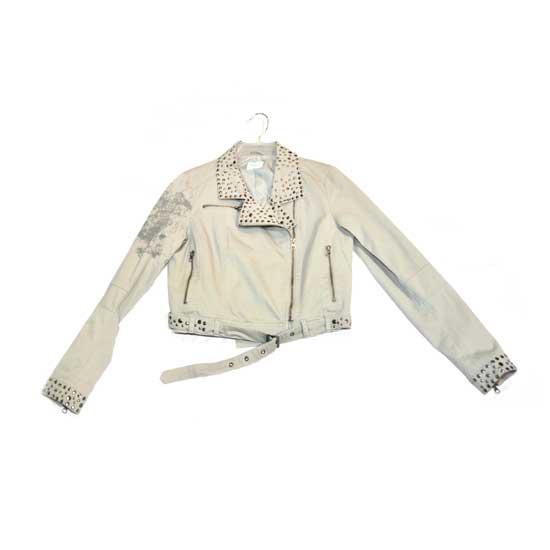 This ladies’ short jacket in khaki features a leather exterior for a luxurious touch. It comes with shiny metallic decorations on the notch collar, cuffs and hem. The oblique golden zipper closure also accentuates the look.