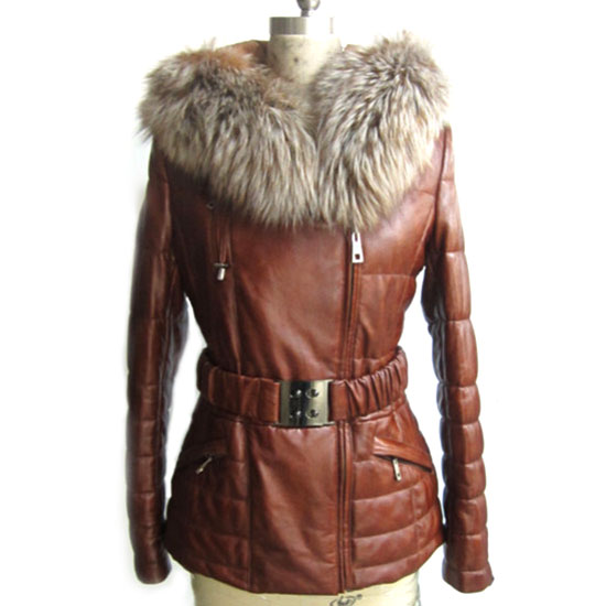 This is a ladies’ leather jacket that comes with a soft and natural texture. It is designed with a fur collar, long sleeves, a zippered front and a belted waist. This fashionable jacket will keep you warm and comfortable on cold days.