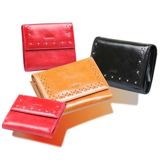 The ladies' leather wallets come with elegant styles. They flaunt tri-fold style with flap-over covers. The hems are decorated with antique studs and small holes for a unique design. These wallets are good gifts for ladies.