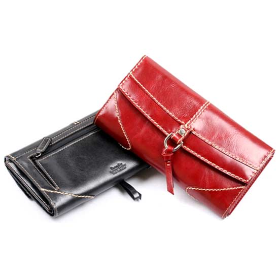 Featured are two ladies' wallets in long styles. They come with tri-fold style with a strap-decorated flap cover. Each wallet features visible stitches for uniqueness. With polished surfaces, the wallets make nice gifts for ladies.