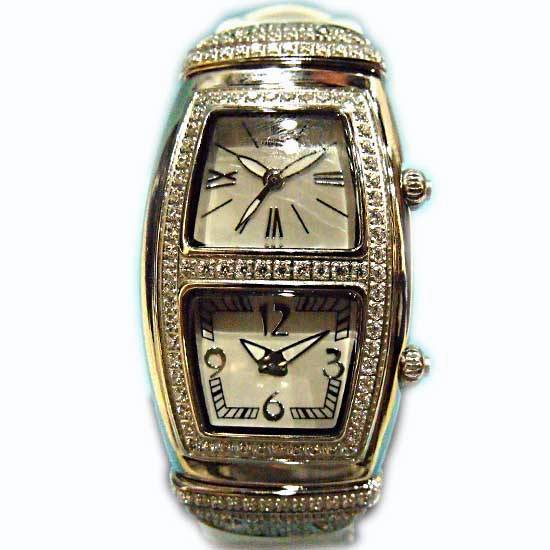 This watch flaunts an elegant appearance with a polished case full of CZ stones. It matches perfectly with the patent leather straps in a flattering way. The dual-window design showcases a distinctive style.