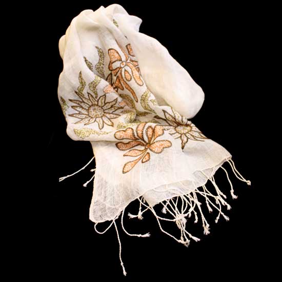 The sophisticated ladies' handmade shawl complements your outfits of various styles all year round with its unpretentious design in white. The finely crafted nature-inspired floral patterns add a glamorous touch to the whole piece, while the pure linen fabric promises a flattering fit with blissful comfort all day long. Complete your all-season wardrobe with this ladies' handmade linen shawl.