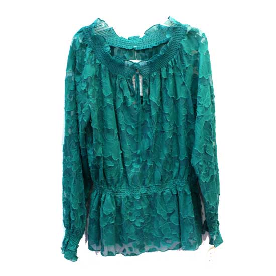 This stunning blouse comes in a green color with subtle graceful floral patterns. It boasts a loose-fit design for a flattering fit. Update your look with this stylish blouse.