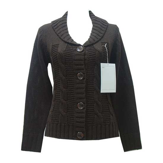 The ladies' sweater features a notched collar and a button placket. The plaited details on the bodice add a decorative touch to the whole piece. This sweater also has nicely finished cuffs and hemline.