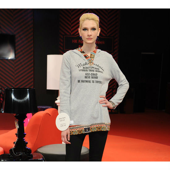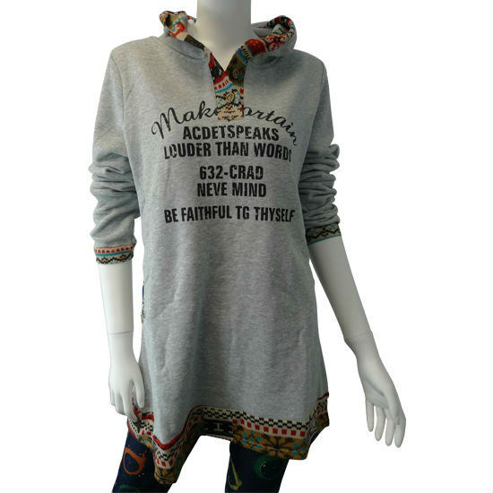 Multicolored pattern trimmed cuffs, neckline and hem.