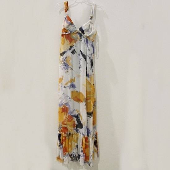 This sleeveless dress radiates an alluring summery appeal with its all-over large floral prints. It features a deep V-neckline, ruffle trim below bustline and a tiered hem. The empire waist looks flattering on almost any body shape. The delicate fabric falls in an ankle length to give out a soft flowing silhouette.