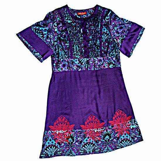 This dress comes with an elegant match of purple, green and red colors. It boasts delicate embroidery on the exquisite printed patterns to provide an oriental style. The smooth and light texture makes this dress a perfect choice for ladies.