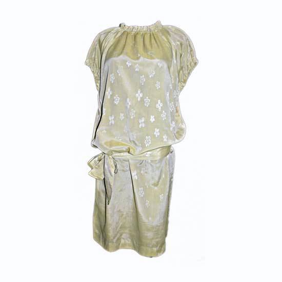 This ladies' one-piece dress features an elastic ruffled neckline and a pair of short cap sleeves. The semi-glossy dress also comes with a belt strap, which serves as decoration and also differentiates the upper and lower parts.